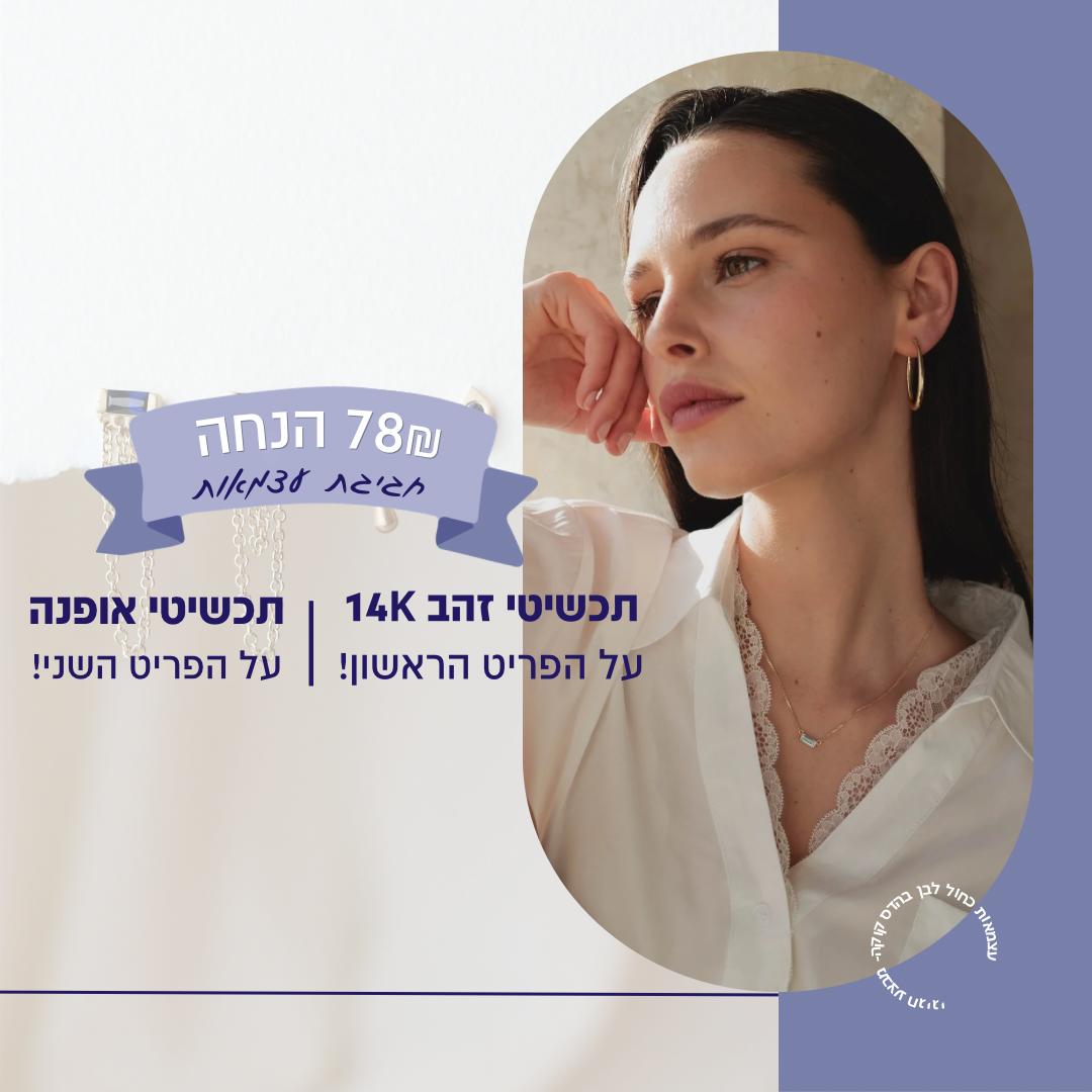 לכבוד חגיגות העצמאות ה-78, תכשיטי זהב 14k ב78₪ הנחה על הפריט הראשון ותכשיטי האופנה ב78₪ על הפרטי השני.